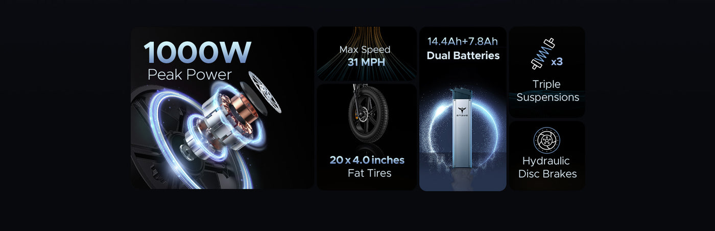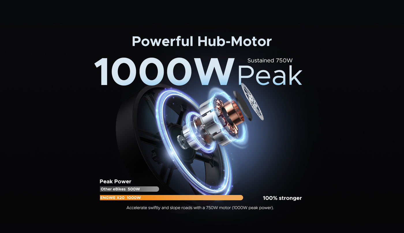 Engwe's X20 is powerful enough to climb steep hills in the city and suburbs.The 100-pound (including the 2 batteries) Â Engwe X20 is equipped with a TRIPLE shock system, which provides a super smooth ride for humans up to about 330 pounds on just about any terrain.